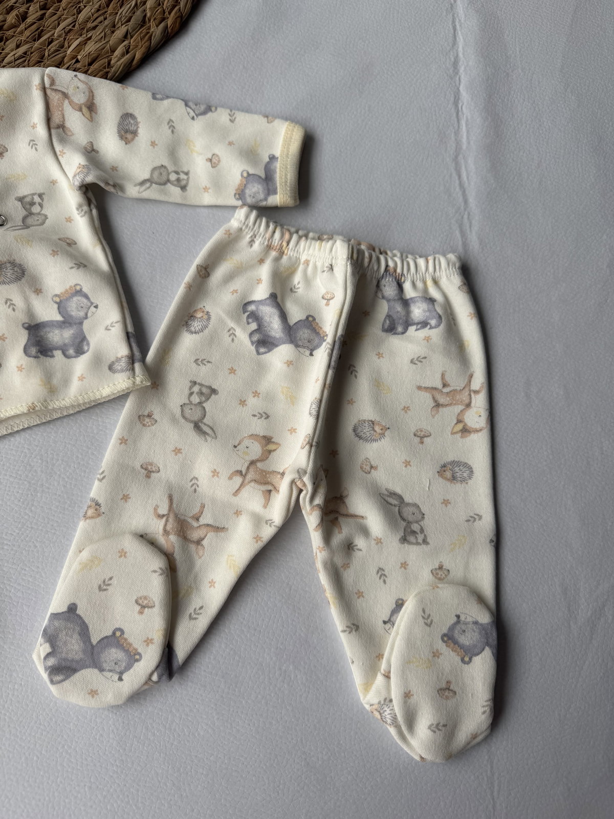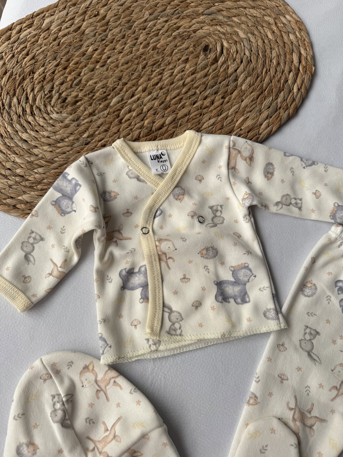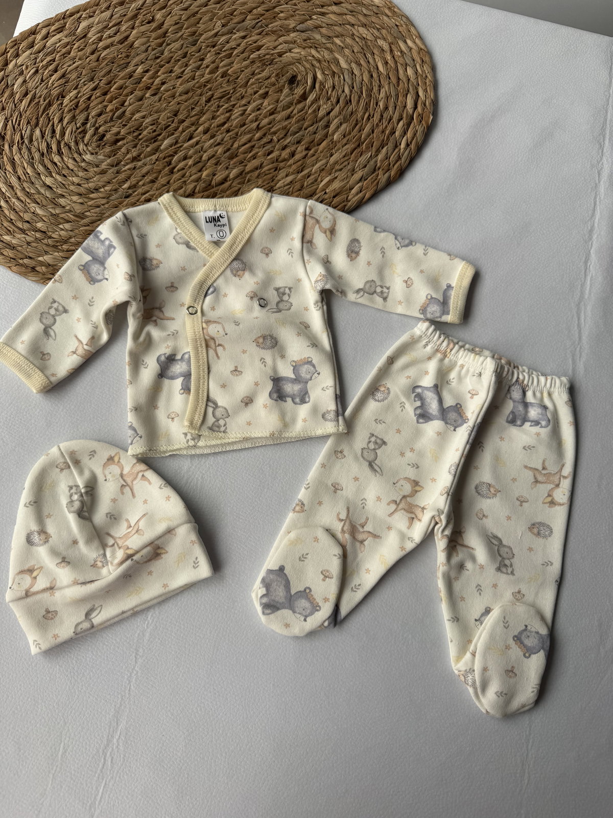 Ajuar 100% algodón, broches metálicos, calidad premium. 3 piezas haciendo juego, talle RN, abarca hasta los 4.200kg