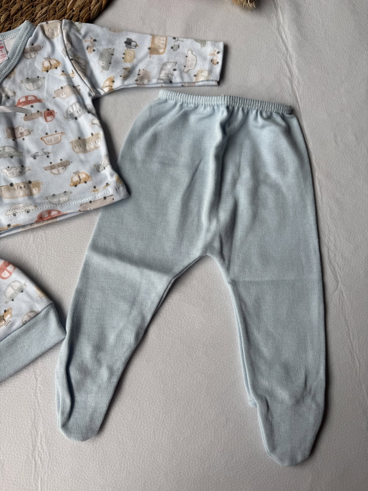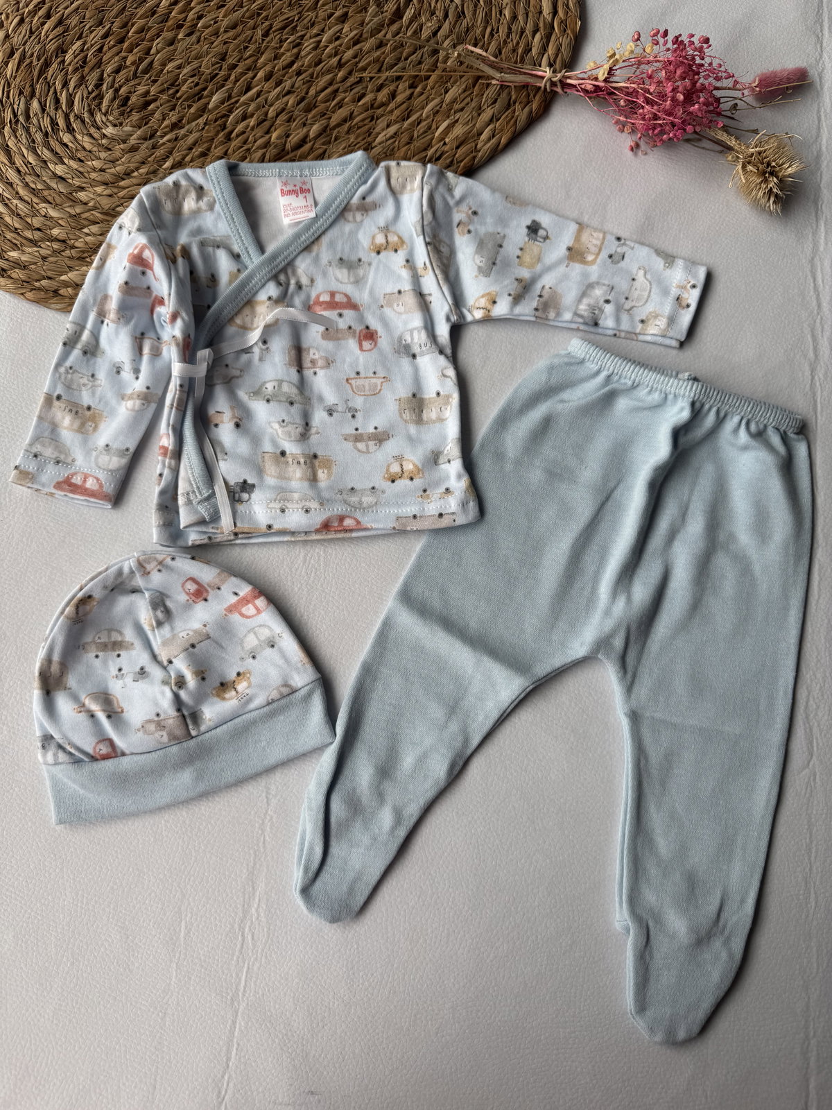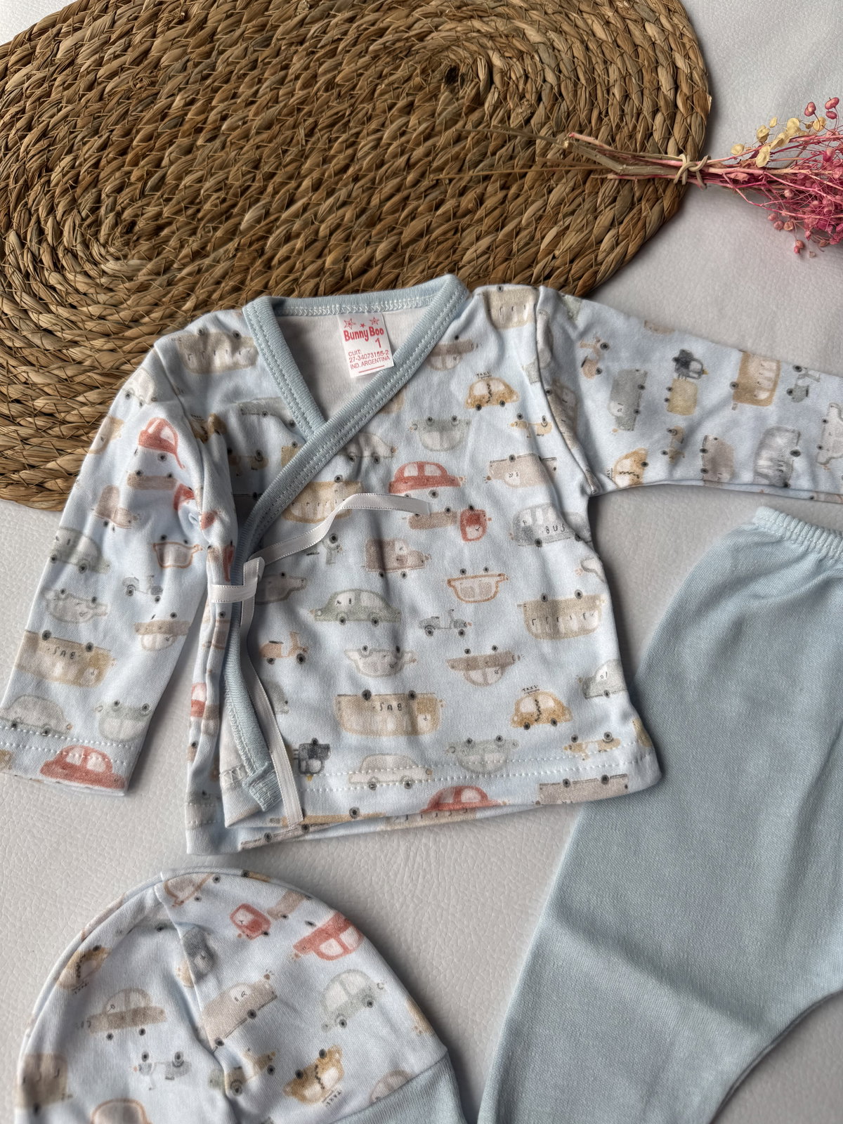 Ajuar  100% algodón p/ atar, calidad premium. 3 piezas haciendo juego, talle RN, abarca hasta los 4.200kg