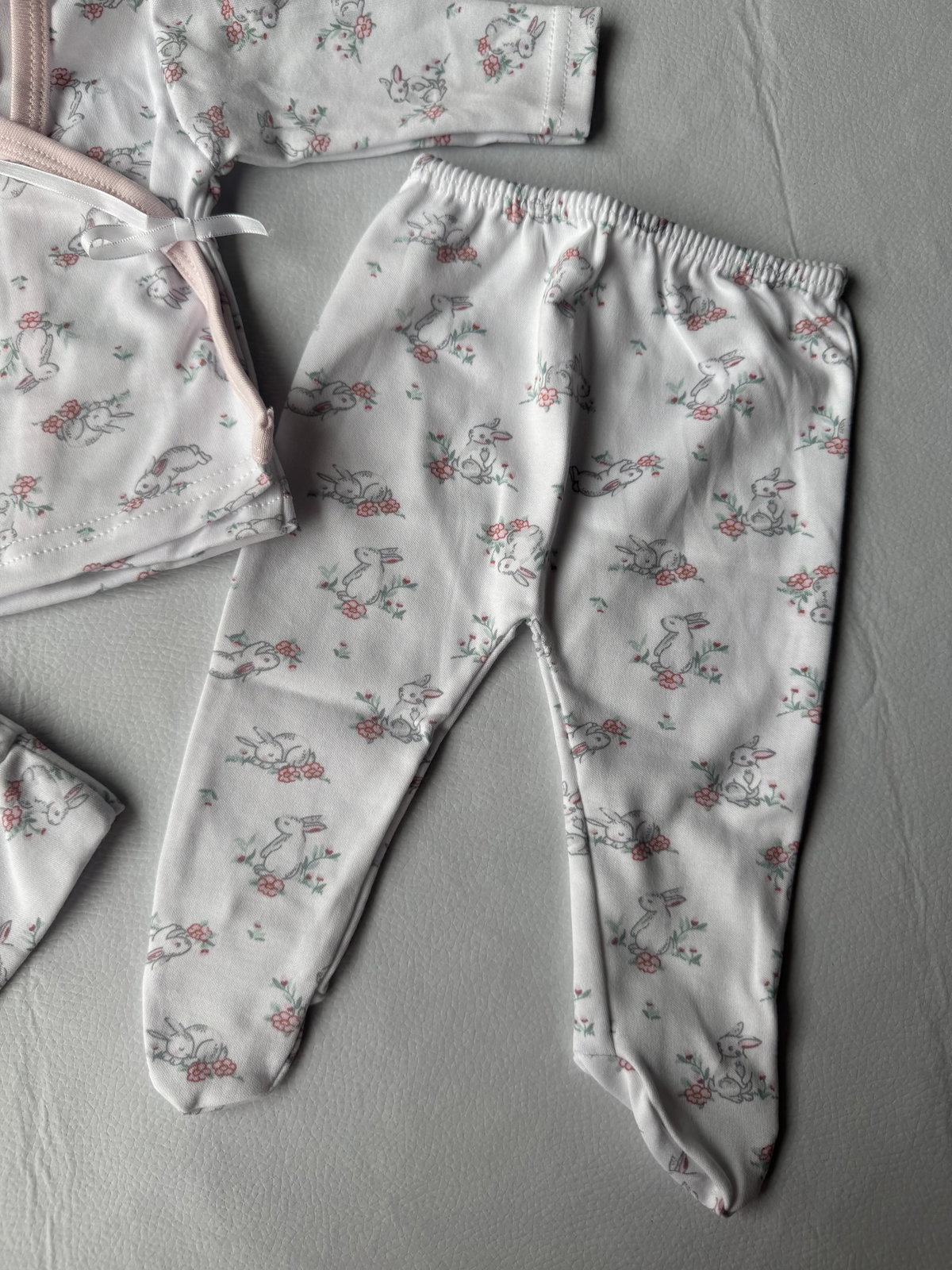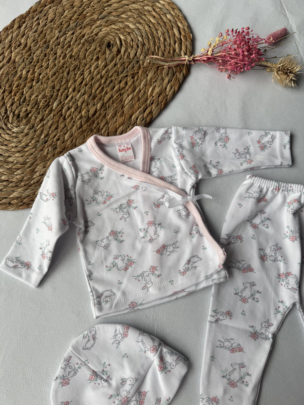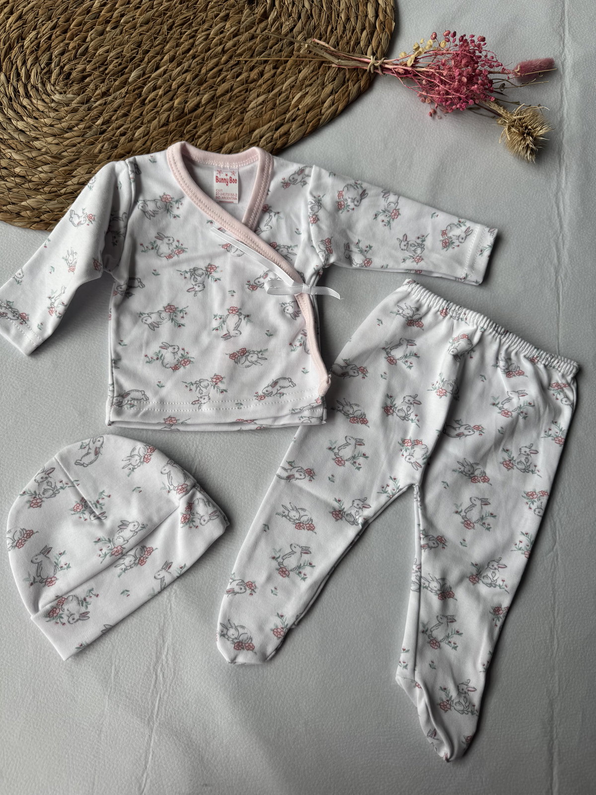 Ajuar  100% algodón p/ atar, calidad premium. 3 piezas haciendo juego, talle RN, abarca hasta los 4.200kg