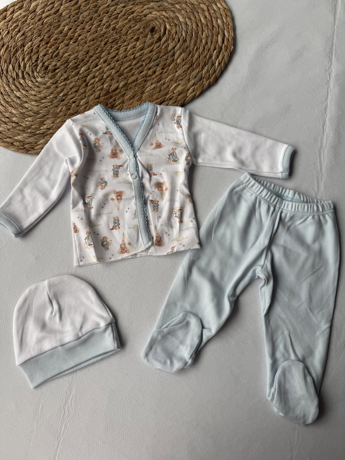 Ajuar  100% algodón, broches metálicos, calidad premium. 3 piezas haciendo juego, talle RN, abarca hasta los 4.200kg
