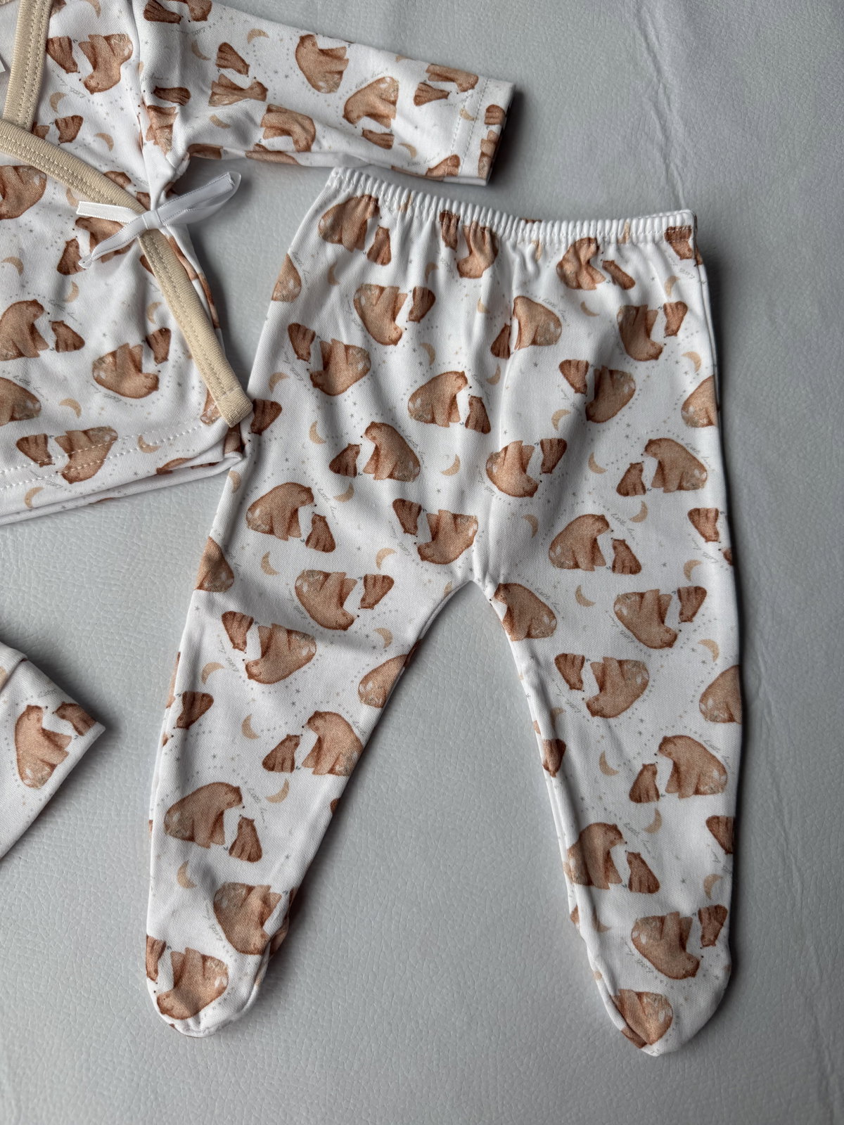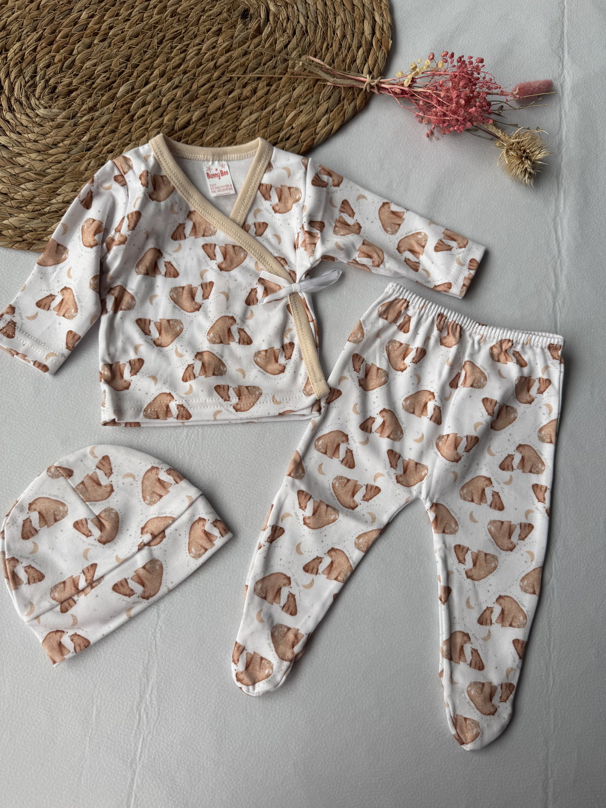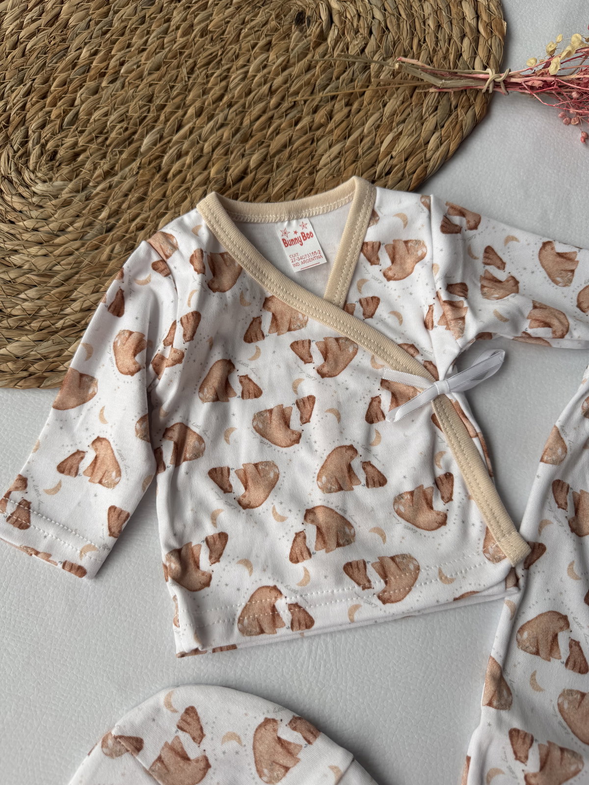 Ajuar 100% algodón p/ atar, calidad premium. 3 piezas haciendo juego, talle RN, abarca hasta los 4.200kg