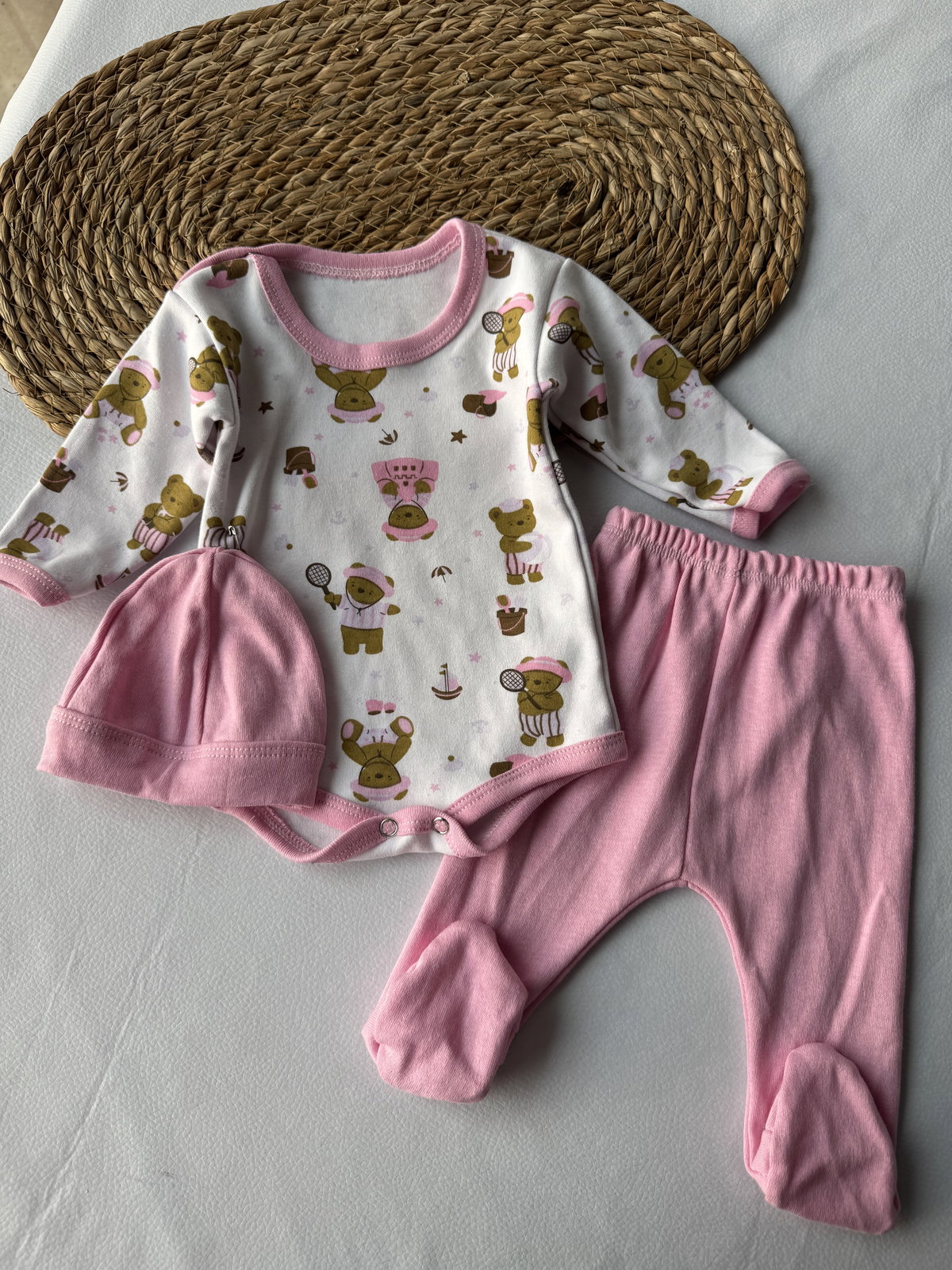 Ajuar bambi 100% algodón, broches metálicos. 3 piezas haciendo juego, talle RN, abarca hasta los 4.200 kg