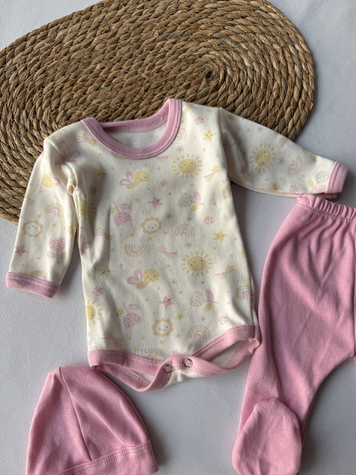Ajuar bambi 100% algodón, broches metálicos. 3 piezas haciendo juego, talle RN, abarca hasta los 4.200 kg