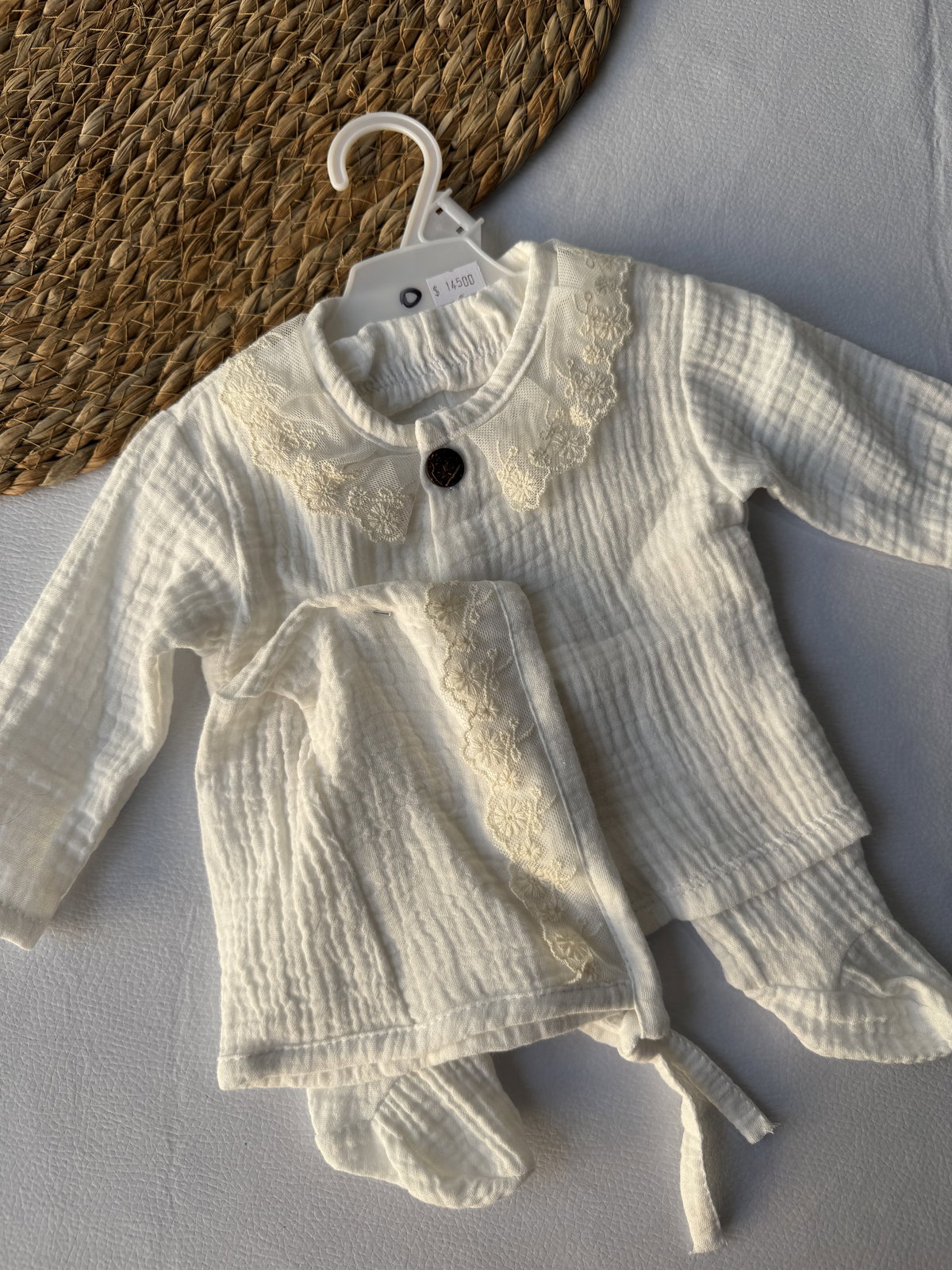 Vonjunto 3 piezas, campera, ranita y gorro haciendo juego, terminaciones en encaje