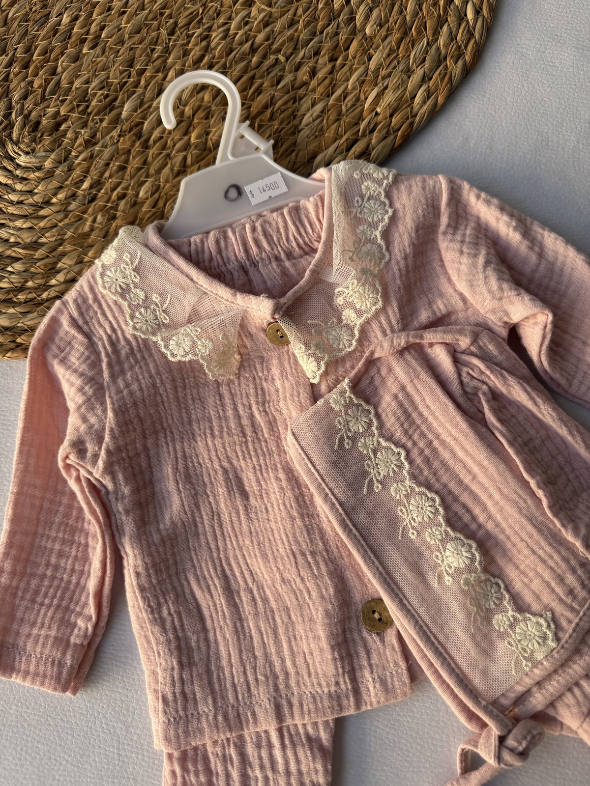 Vonjunto 3 piezas, campera, ranita y gorro haciendo juego, terminaciones en encaje