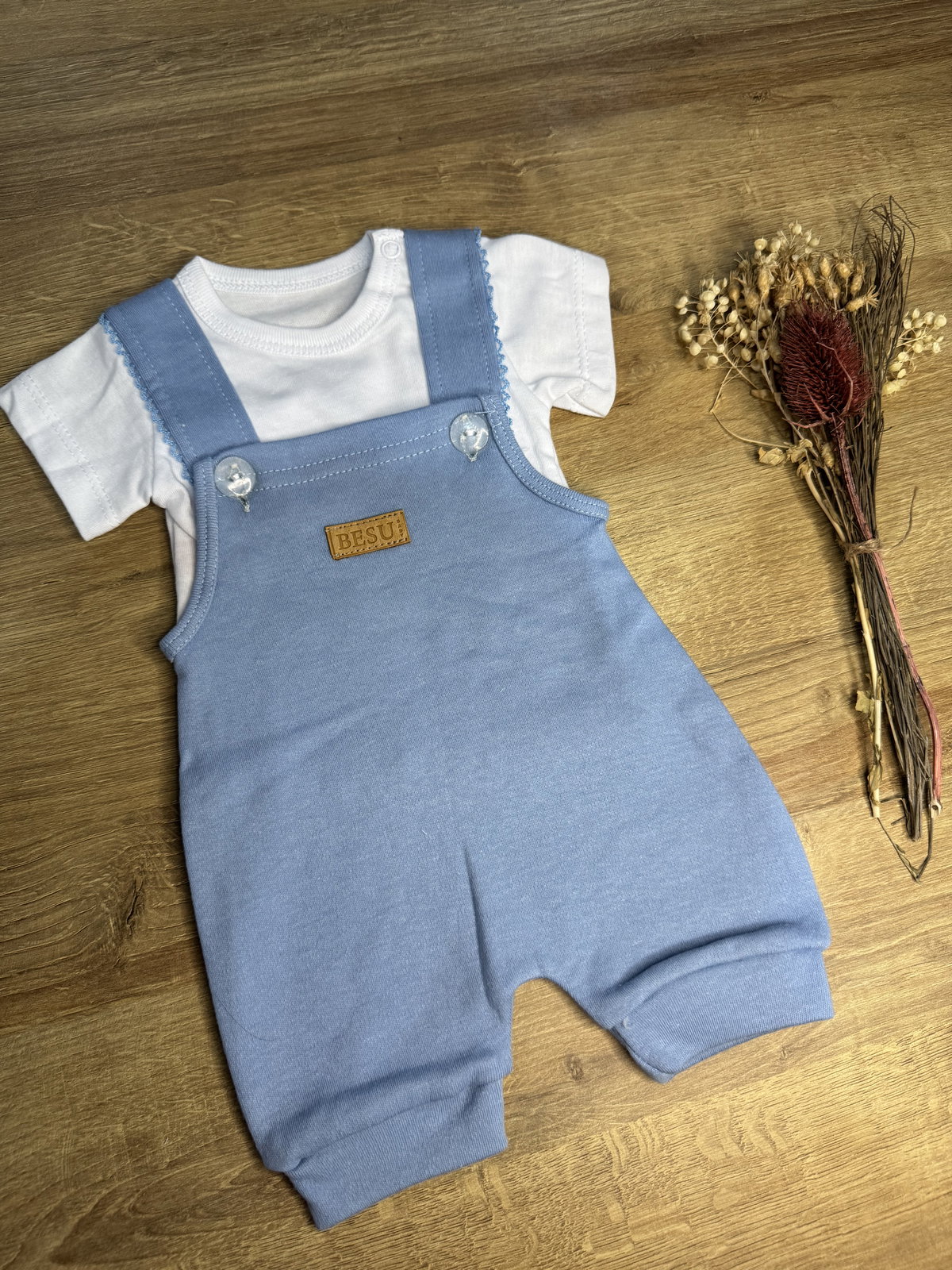 Jardinero corto, 100% algodón, conjunto con remera, terminaciones en picot