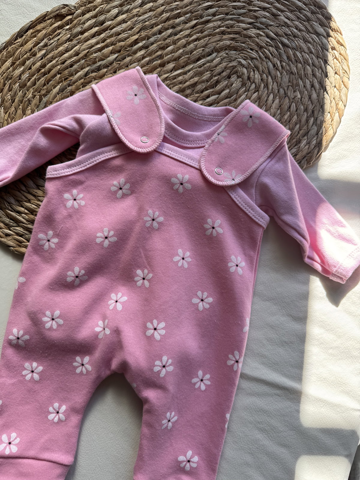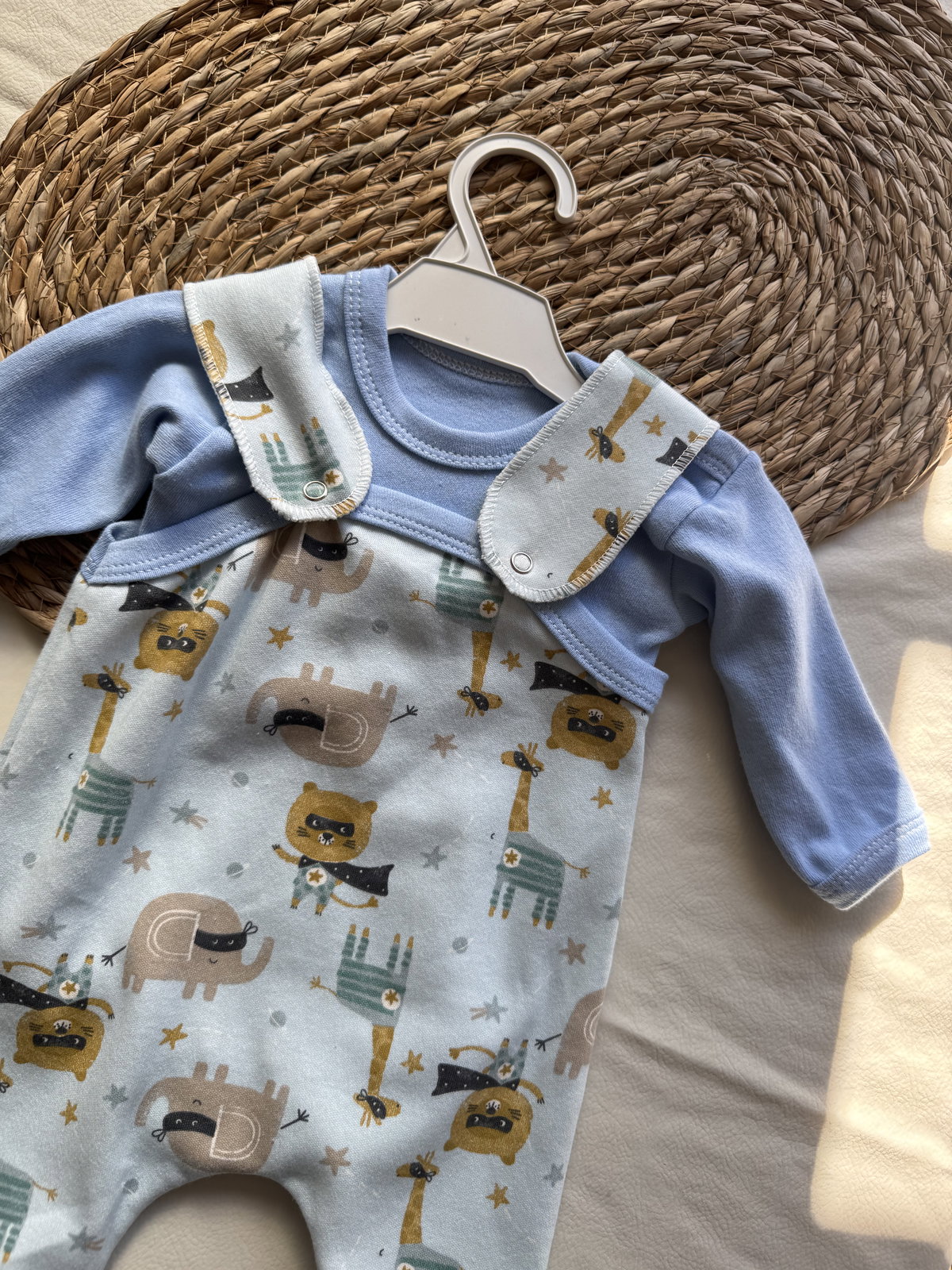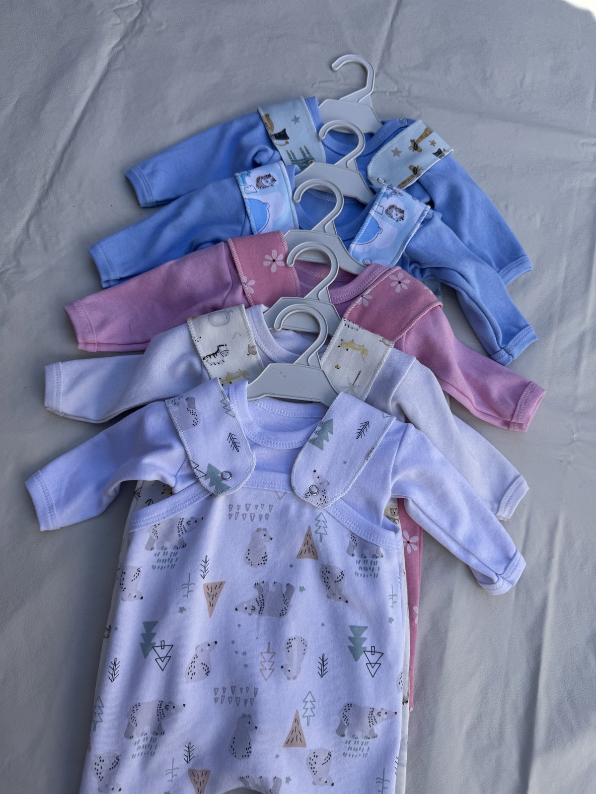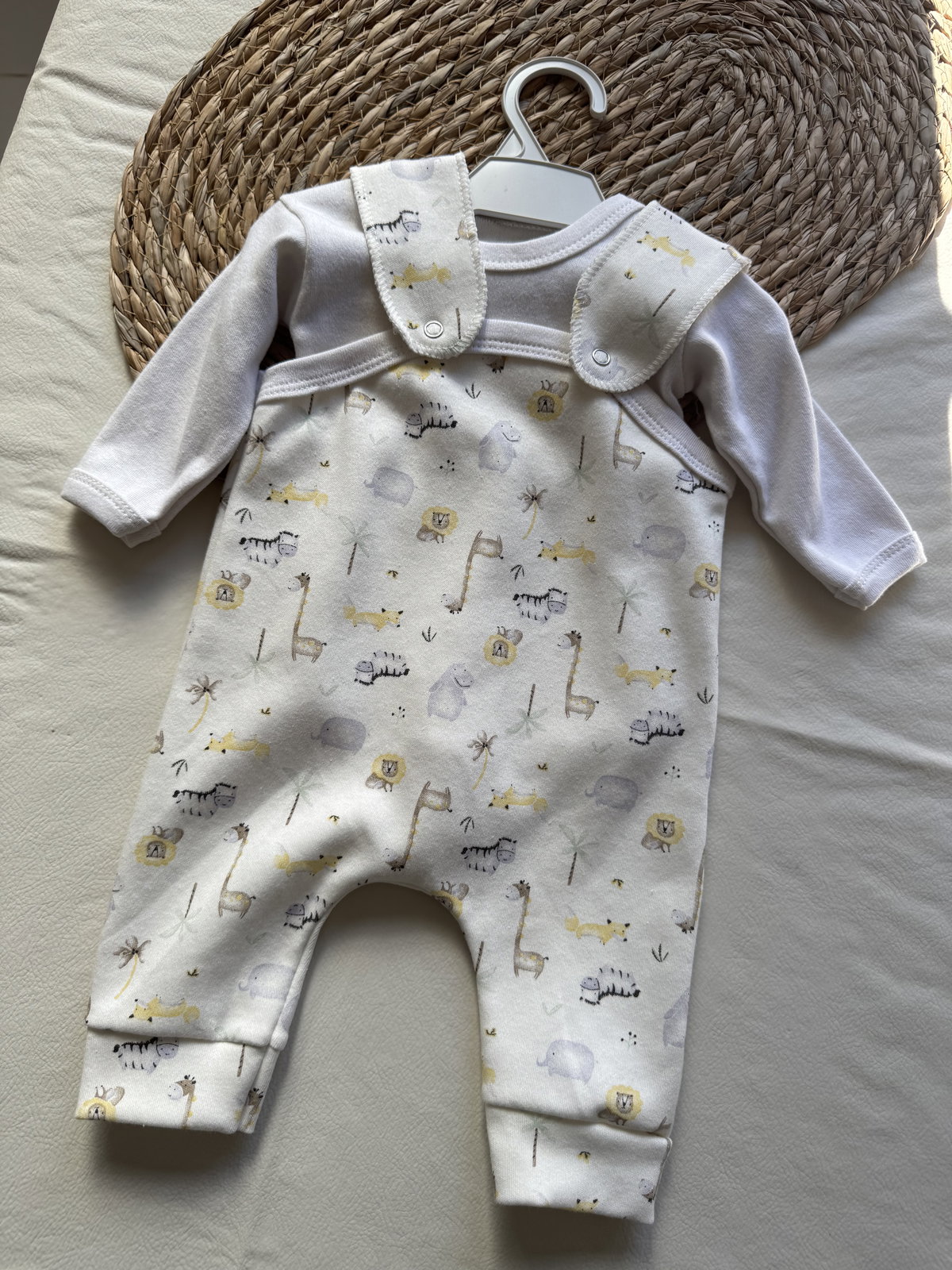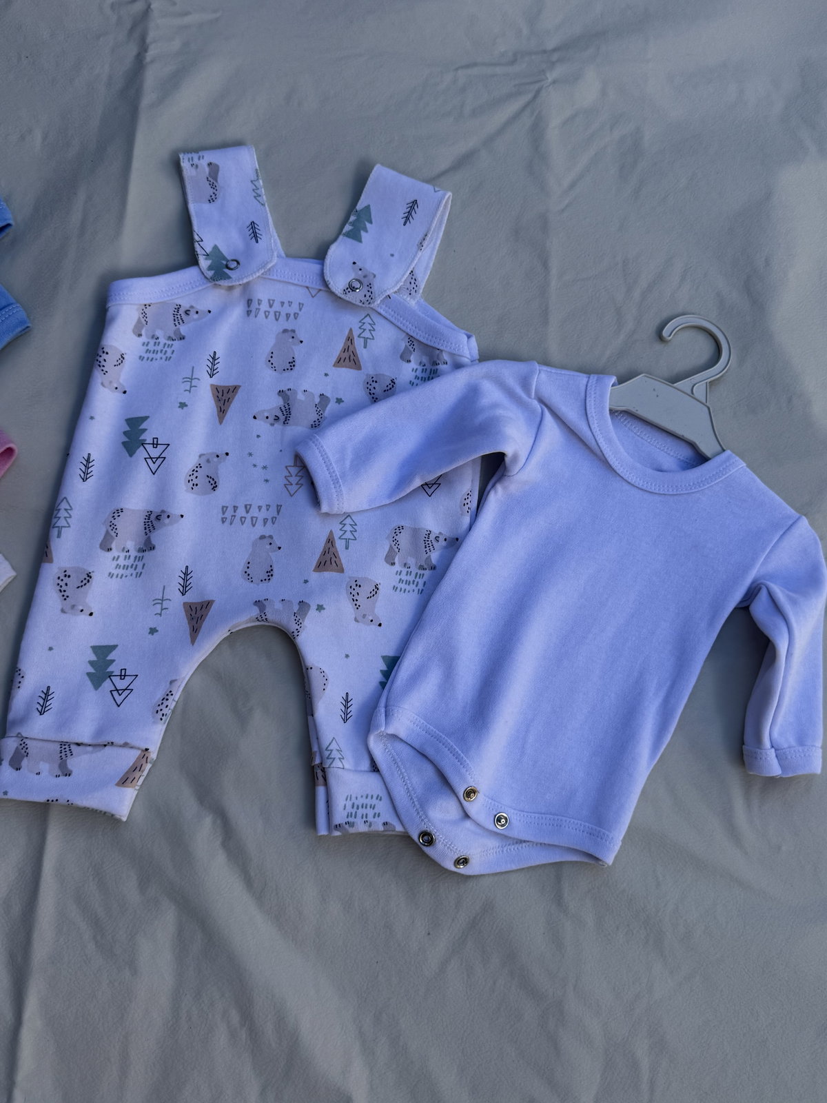 Jardinero con body haciendo juego, broches metálicos. Talle RN abarca hasta los 5 kilos aproximadamente. Estampas surtidas