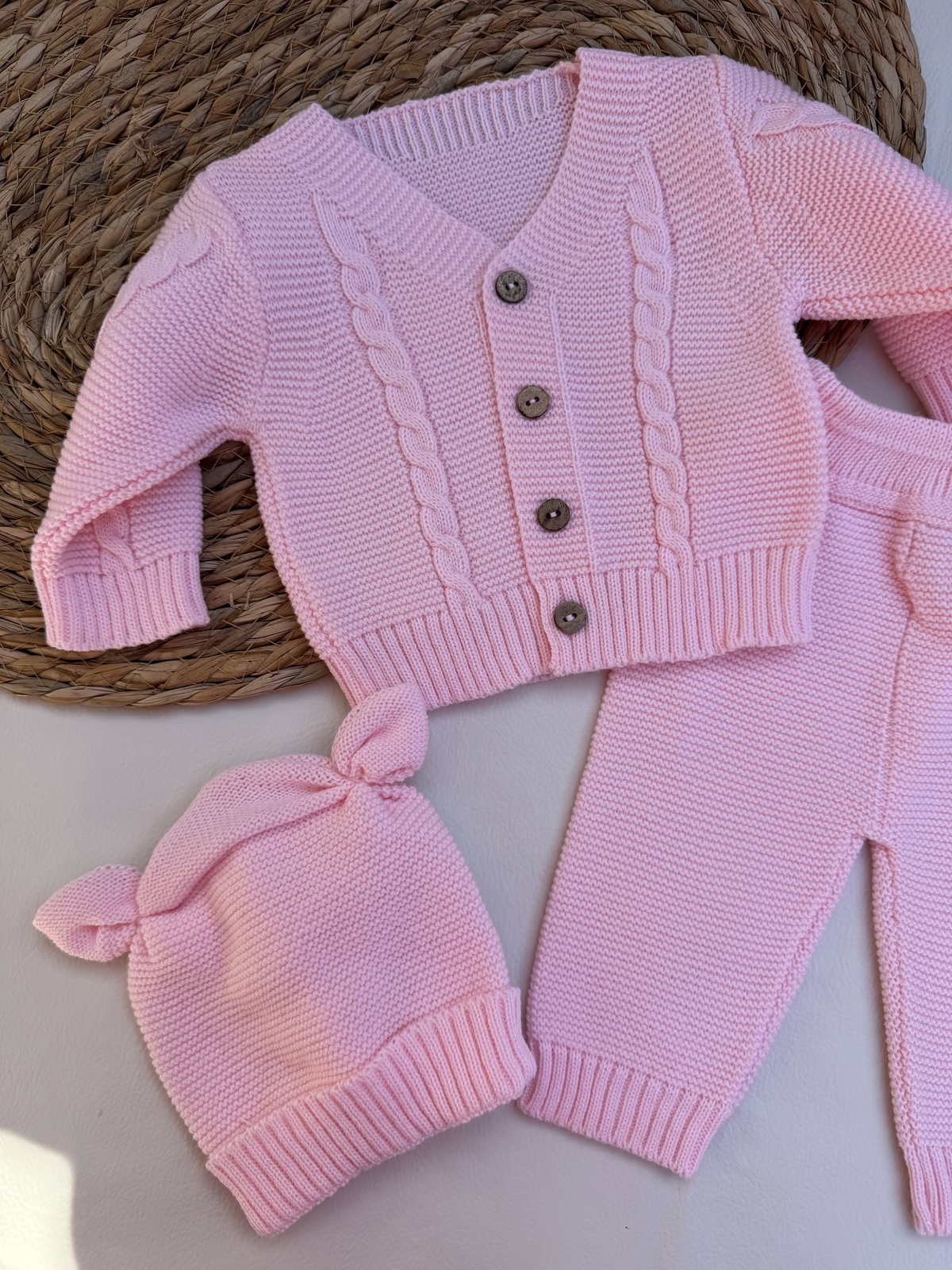 Trío tejido Rosa, botones de madera, tejido calidad premium, gorro, pantalón y campera haciendo juego.