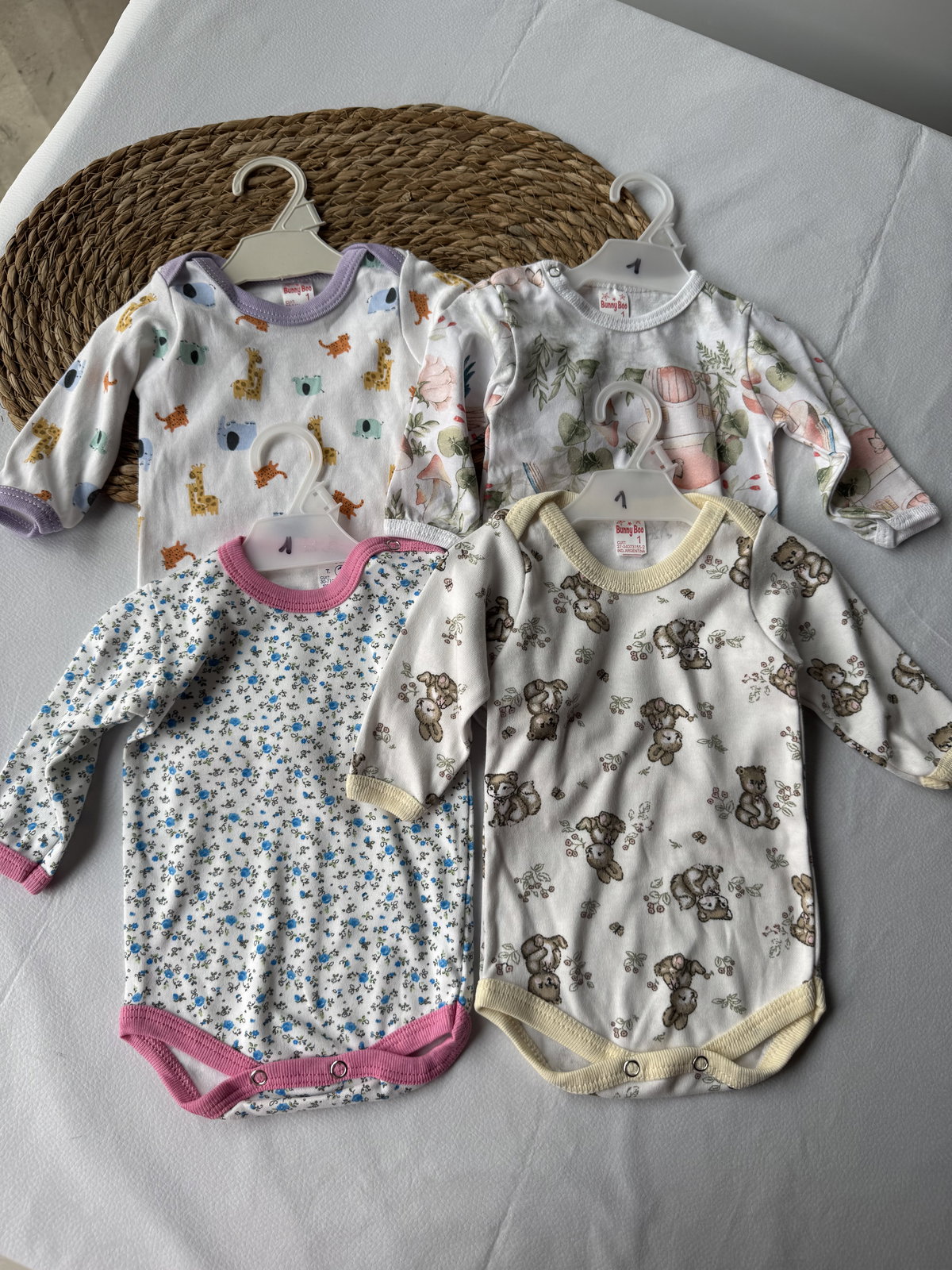 Bodys talle 1, abarca 0 a 3 meses. 100% algodón. Cuello americano o con broche. Broches metálicos