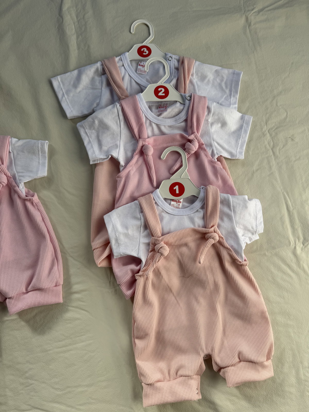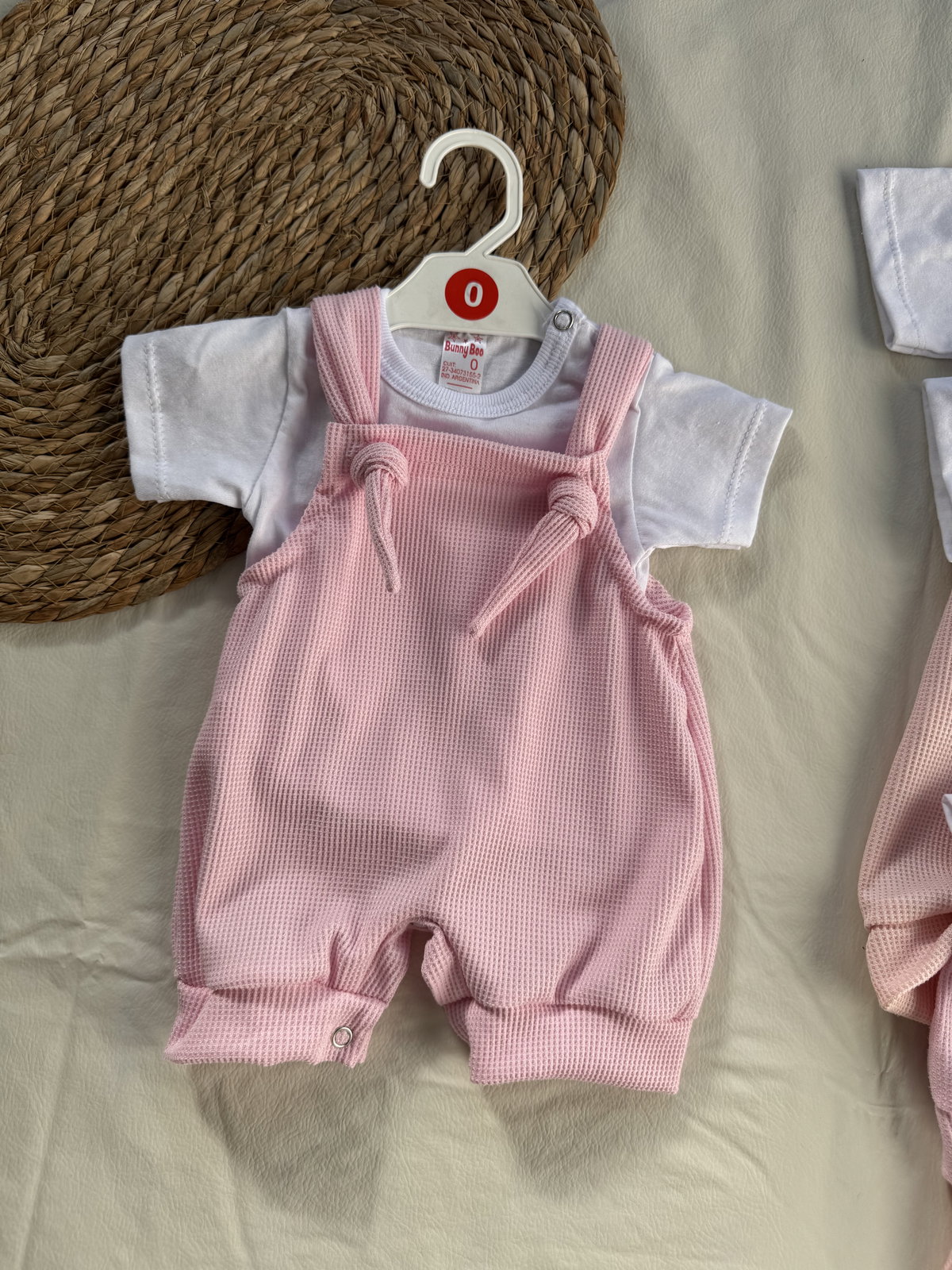 Jardinero rosa tela wafle con remera haciendo juego. Broches metálicos