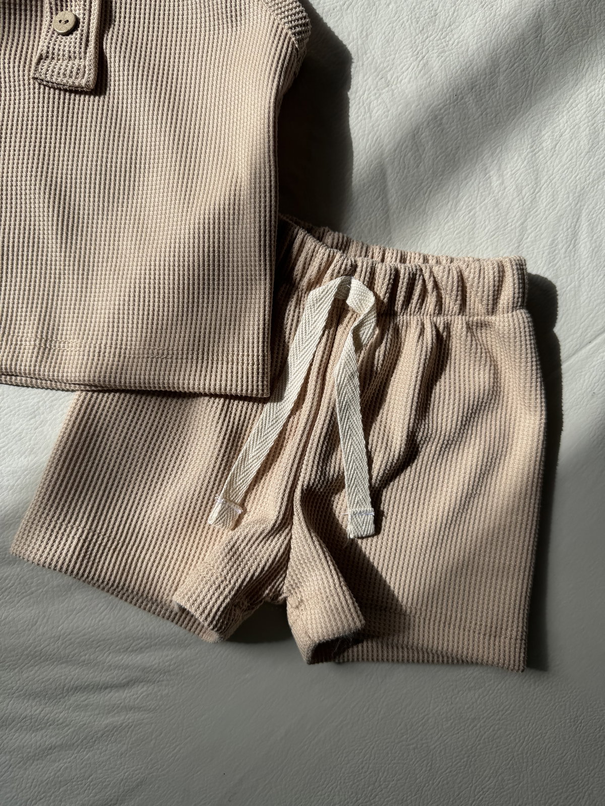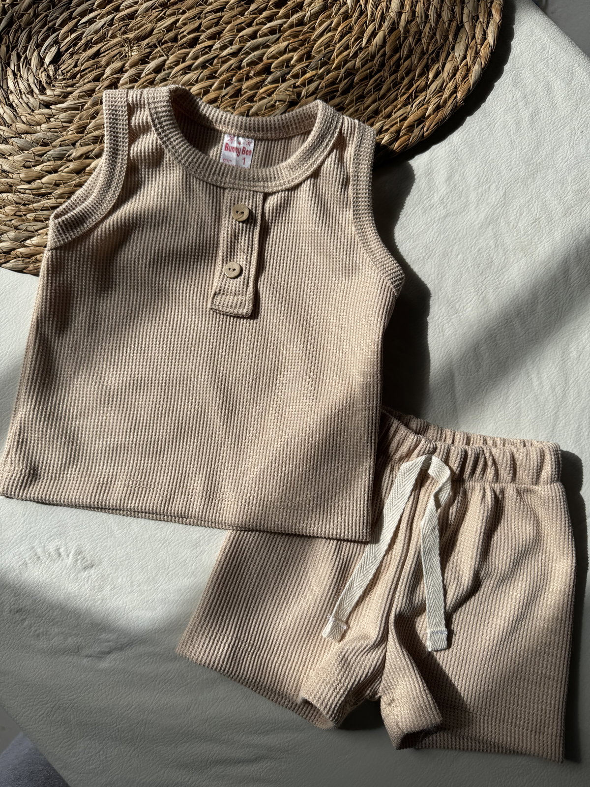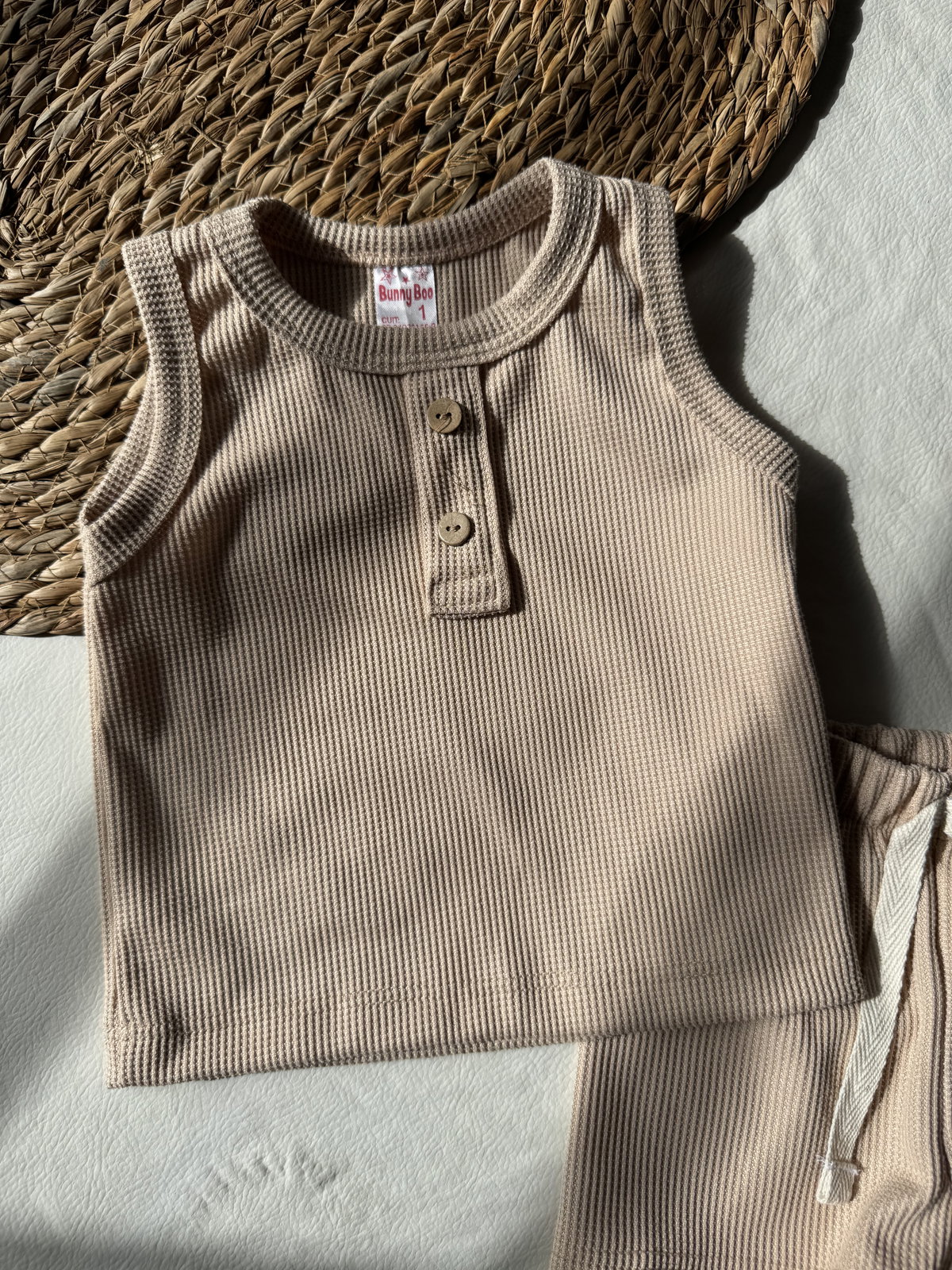 Conjunto wafle para bebito. Pantalón corto y body musculosa corta haciendo juego, prendedores metálicos