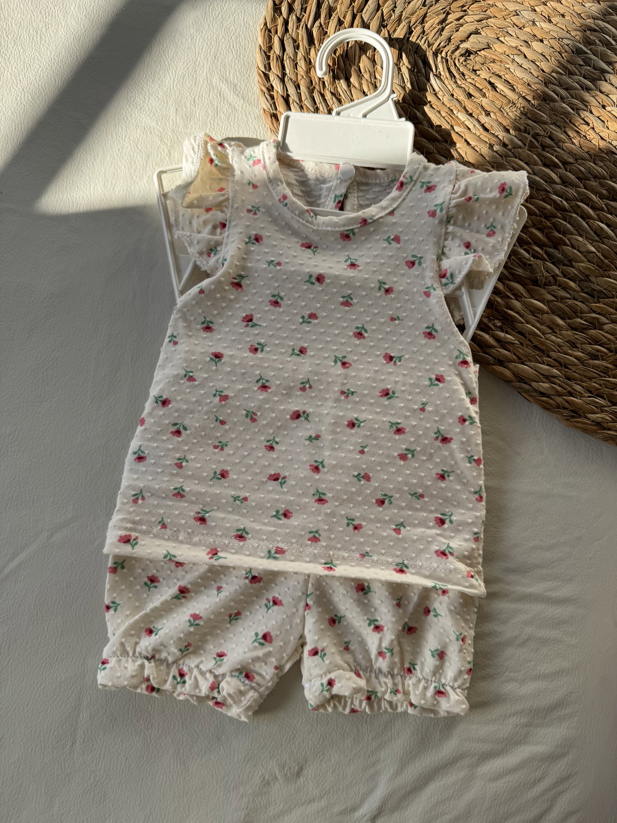 Conjunto floreado, tela piqué elastizada. Remera con volados haciendo juego con pantalones corto. Calidad premium.