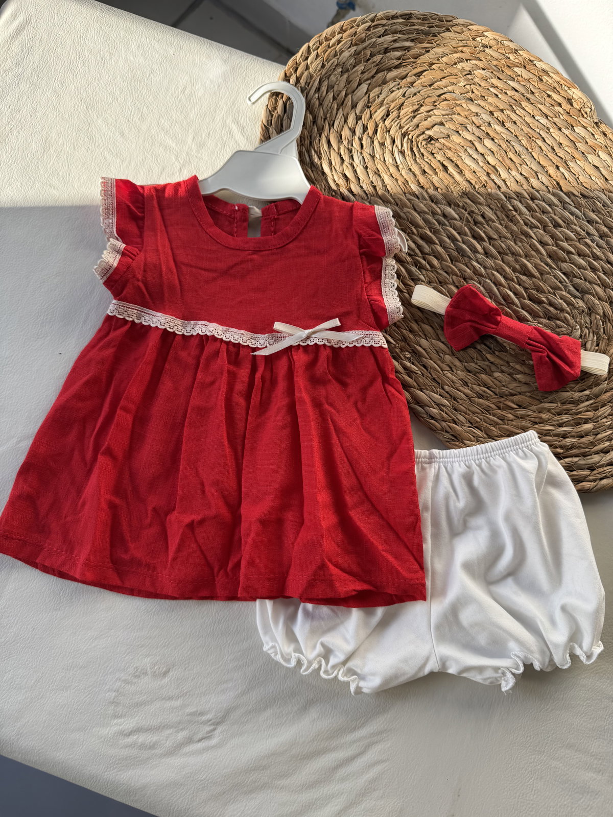 Vestido rojo símil lino, conjunto con bombachudo de modal y vincha haciendo juego.