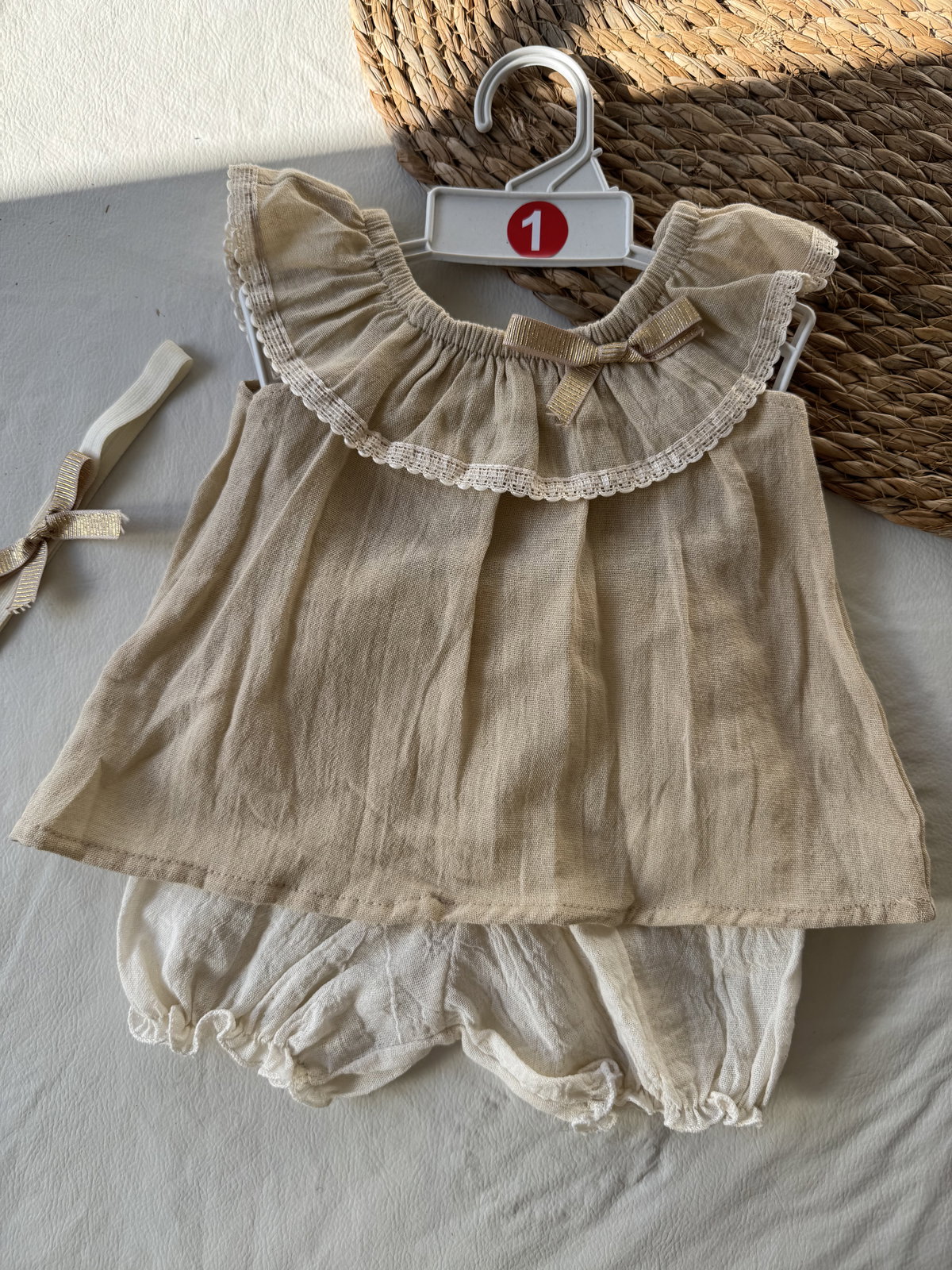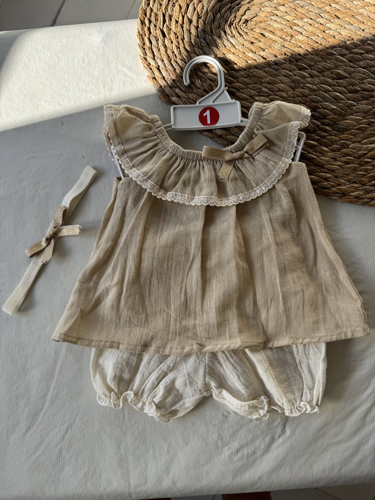 Conjunto símil lino tres piezas, vestido, bombachudo y vincha haciendo juego
