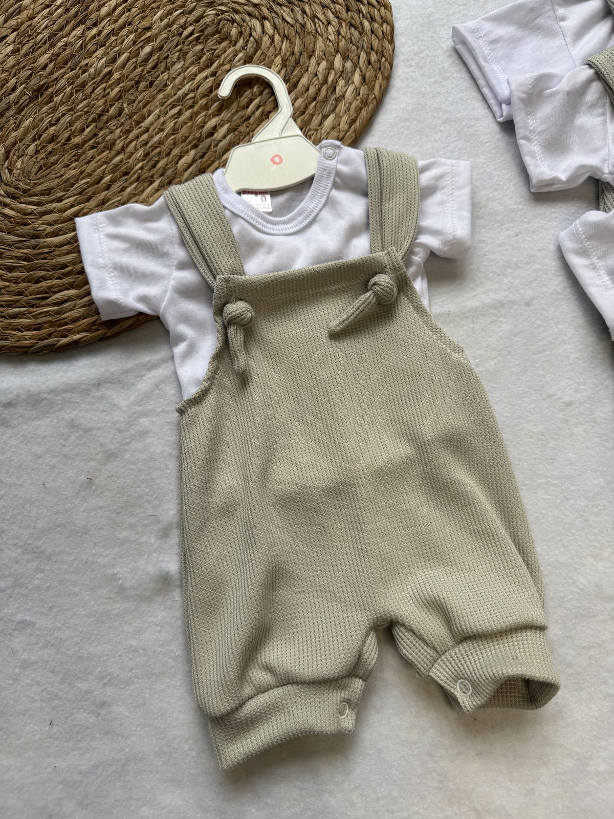Jardinero rosa tela wafle con remera haciendo juego. Broches metálicos