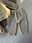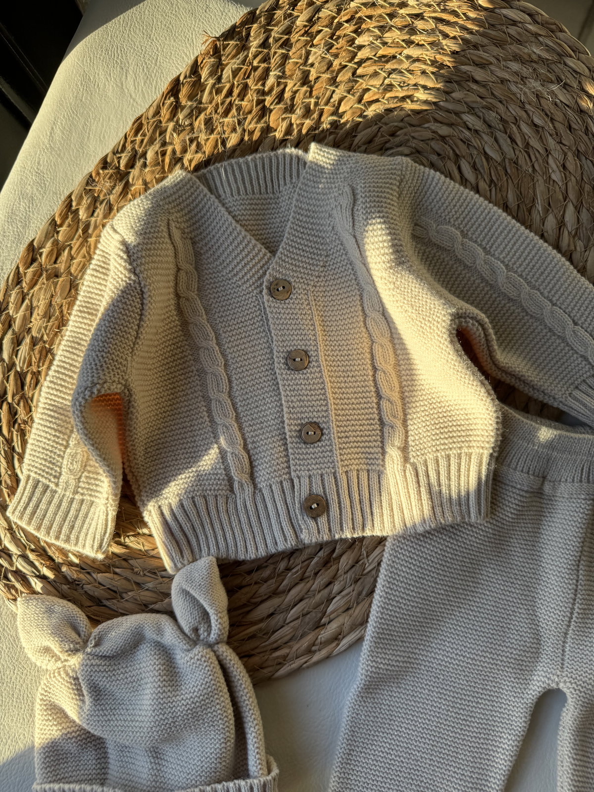 Trío tejido beige, botones de madera, tejido calidad premium, gorro, pantalón y campera haciendo juego.